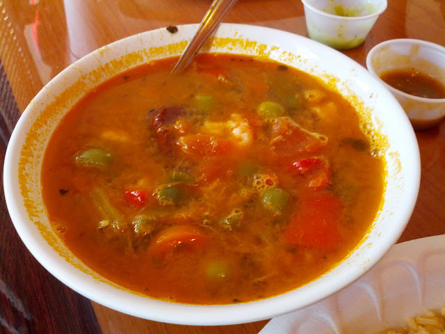 I ordered the #6: Two taco combo. One shrimp, one fish. Sides of beans and rice. Comes with a drink and – I got jamaica (hibiscus). $5.25, plus about $2 for the agua fresca. Adam got the seafood sopa for $6.95, and we swapped halfway through. The tacos were good, but not as amazing as I had hoped – Adam and I were both surprised that the protein of both tacos was fried. Fish tacos, in my limited experience, are typically fried, but the breaded, fried, shrimp surprised us. The seafood sopa was fine. It seems on par with Mariscos‘ (though less variety than Mariscos), but not as good as Tijuana’s.